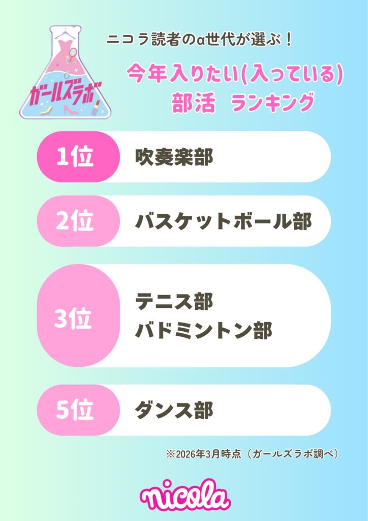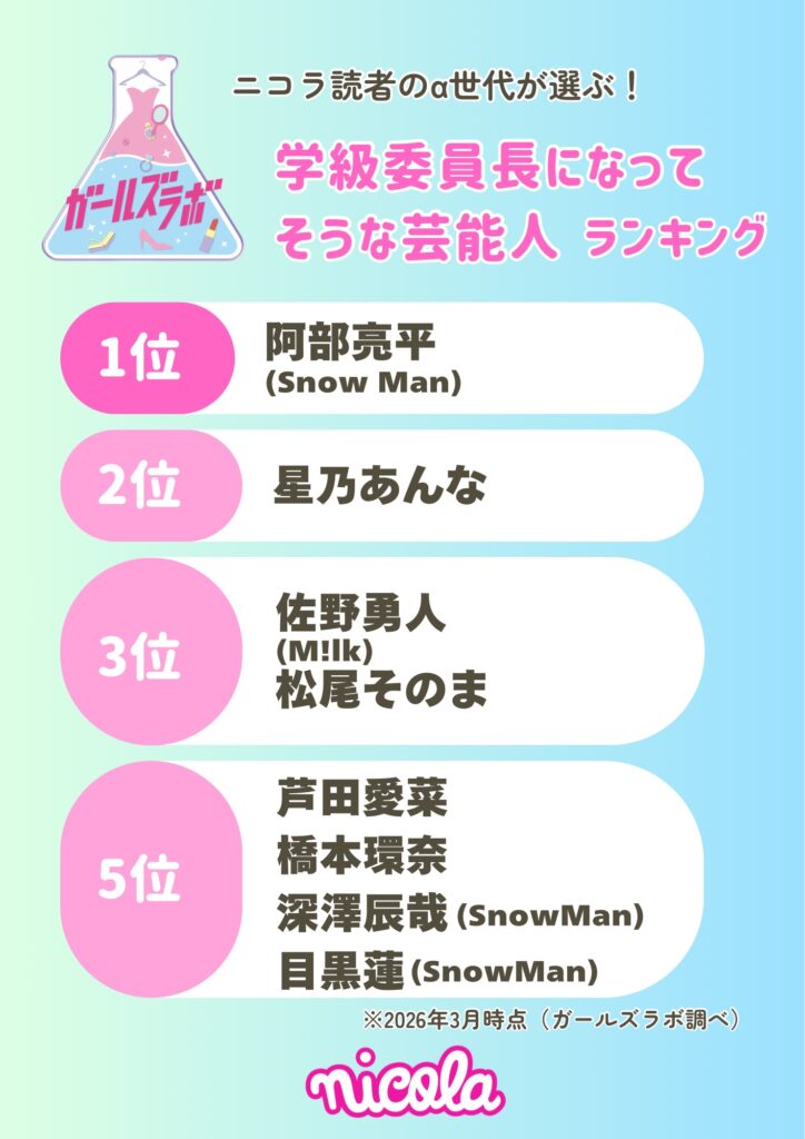 今年入りたい部活ランキング1位は吹奏楽部に!学級委員長になってそうな芸能人ランキングでは、アイドルと勉強両立しているSnowManの阿部亮平さんが選ばれたよ☆