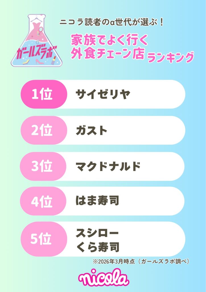 家族でよく行く外食チェーン1位にはサイゼリアがランクイン!安いから友達ともたくさん行くという声がたくさん集まったよ!