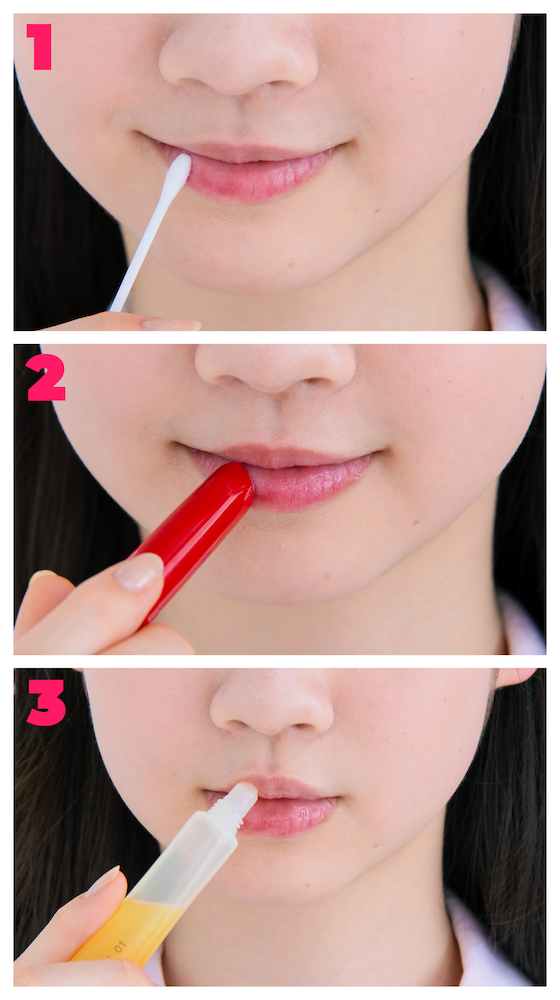 ①無色のリップクリームで唇全体を保湿する。夜寝る前にも塗って、唇の皮向けやひび割れを防ごう!