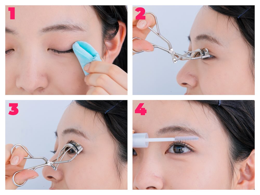 ②ビューラーをまつげの根元にフィットさせ、軽くはさむ。手首だけでなく腕全体で動かすと、力が入りすぎずきれいに仕上がるよ☆