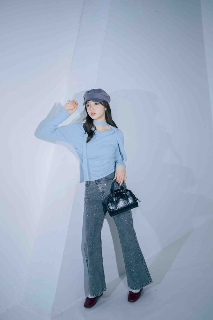 ビジューつきでギラっとしたフレアデニムでスタイルアップ。バレエシューズをあわせてレディに仕上げよう。コーディネイト全体のトーンも寒色で姉っぽく。
