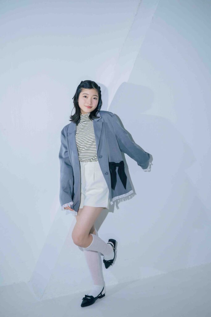 リリカ☆リボンジャケット¥6590/ems excite トップス¥3850/マジェスティックレゴン(シティーヒル) パンツ¥1999/グレイル ヘアクリップ(2個セット)¥550/パリスキッズ 原宿本店 ハイソックス¥1100/靴下屋(タビオ) ミュール¥3480/VIVIAN COLLECTION