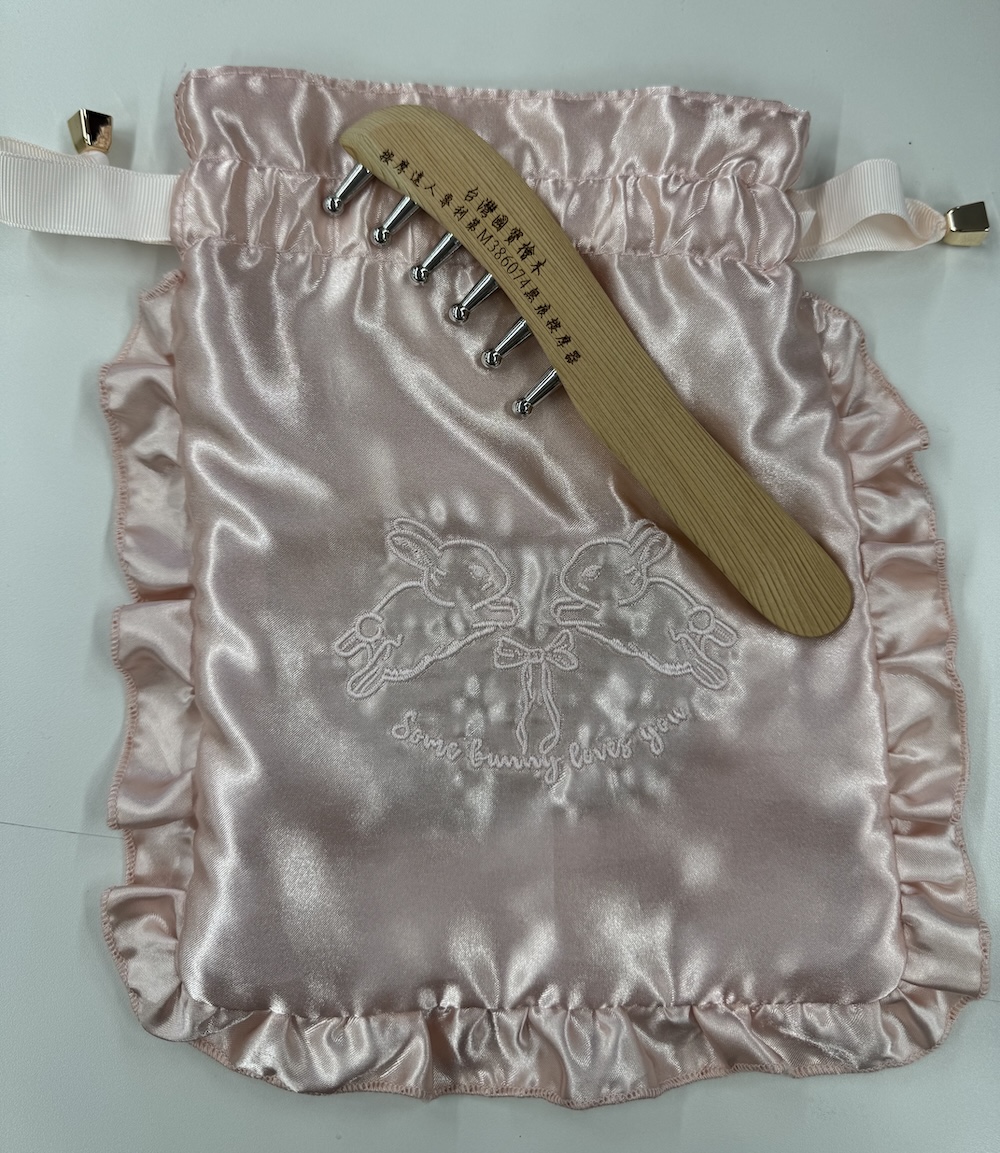 「巾着はデザインにひとめぼれ♡大きめサイズで、いろいろ入るのも嬉しいポイント。無痕かっさは、顔のむくみケアに使っています!」