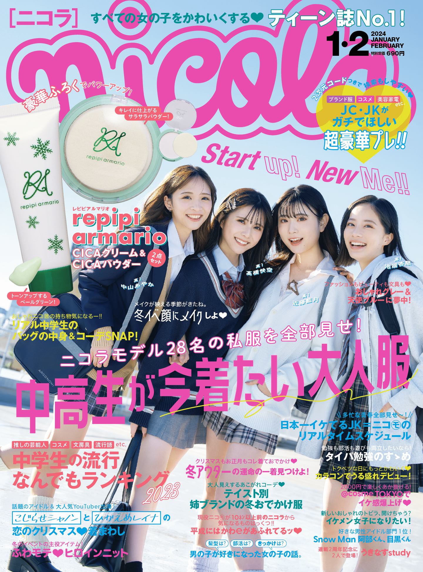 Back Number2024 2023 2025 2024年1・2月号 Cover Model 中山あやか 髙橋快空 近藤藍月 池端杏慈 2024年3月号 Cover Model 伊藤沙音 小松崎ふたば 2024年4月号 Cover Model 池端杏慈 2024年5月号 Cover Model 有坂心花 星乃あんな 2024年6月号 Cover Model 足川結珠 池端杏慈 近藤結良 髙橋快空 2024年7・8月号 Cover Model 松尾そのま 2024年9月号 Cover Model 小松崎ふたば 有坂心花 2024年10月号 Cover Model 星乃あんな 伊藤沙音 松田美優 白水ひより 2024年11月号 Cover Model 星乃あんな 梨里花 2024年12月号 Cover Model 吉本麗南 有坂心花 榎本月海 Rankingランキング ライフスタイル 2025.12.08 JCがもらってうれしいクリスマスプレゼントランキング2025!【ガールズラボ】 ガールズラボ 2025.12.05 冬休みは“アピナ”に行こう!!中高生におすすめのおしゃれスウェットコーデ3選★<モデルのサイン入りプレゼントも!!> 星名ハルハ 白水ひより 青山姫乃 ライフスタイル 2025.12.12 【中学生の流行 なんでもランキング2025♡】今年の流行語・恋人になってほしい人1位は? ガールズラボ ファッション 2025.12.11 今年の冬は“ファー”が着たい!!<中高生モデルのファーコーデ4選>【葵かんな、泉有乃、大月美空、大森ひかる】 大月美空 大森ひかる 泉有乃 私服 葵かんな ファッション 2025.12.11 流行りのレザージャケット、どう着こなす?<すぐに真似できる、最旬甘辛MIXコーデ5選> 佐々木花奈 星乃あんな 星名ハルハ 松尾そのま 松田美優 私服 2025.12.12 レピピアルマリオ×ニコラコラボが今年も登場!!<冬コーデを一気にあか抜けさせる主役級アイテム> 十文字陽菜 星乃あんな 松尾そのま 松田美優 ファッション 2025.12.01 ママ友を「あっ!」と言わせる!!敏腕スタイリスト発シーン別ママファッション5選【親ニコラ】 親ニコラ 連載 2025.12.09 寒いよォー凍えるー🫸🫨🫷そんな私のwinterコーデ꒰(๑´•.̫ •`๑)꒱💛【ニコラガールズ/神保來美】 ニコラガールズBLOG 神保來美 連載 2025.12.11 ほのかのおすすめの冬紹介⛄️❤️❤️冬といえばやっぱり、、⁉️【ニコラガールズ/花岡穂果】 ニコラガールズBLOG 花岡穂果 ライフスタイル 2025.12.13 イルミ、クリパ、JKケーキ…2025年トレンドはこれ!みんなのクリスマスの過ごし方を写真で教えてもらったよ! Close