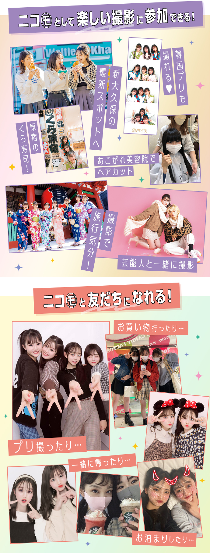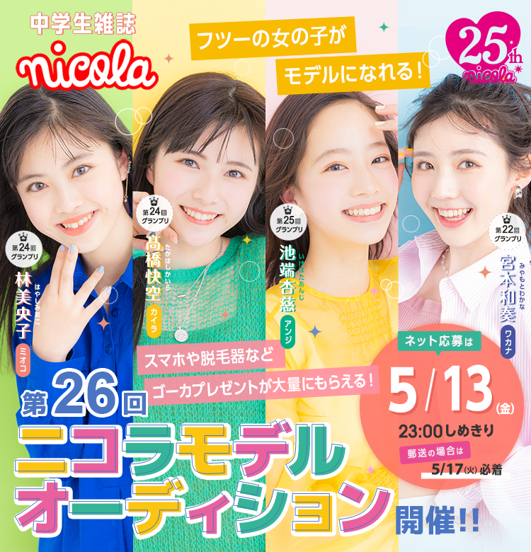 | 応募資格 | • 10歳(小5)~15歳(中3)の⼥の子 • ⾝⻑150cm以上 • 国籍、住んでいる場所はどこでもOK! 今年は事務所に所属している子も応募OK! 【⾃分で応募】 「ニコ㋲になりたい!」「芸能界デビューしたい!」などの夢がある子はぜひ! 応募したことは友だちにはバレないので安心してね。保護者の方に許可をもらうのを忘れずに! 【友だちすいせんで応募】※郵送応募のみ 姉妹や友だちにニコ㋲にすいせんしたい子がいたら、本⼈に許可をもらって二コラ本誌についている応募用紙で送ってね。 ※友だちすいせんのプレゼントがもらえるのは10歳(小5)~15歳(中3)の⼥の子の場合のみ。 |
