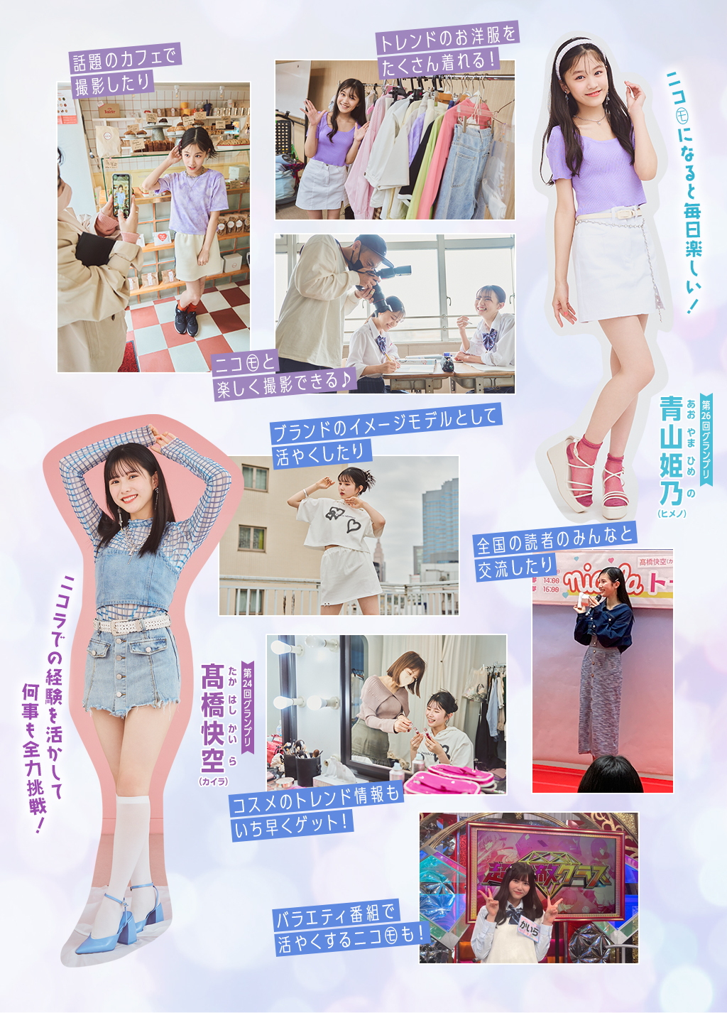 ニコラモデル(通称ニコ㋲)はすべて本誌専属で、現在中1~高1まで24名が在籍。読者と同世代のニコ㋲たちは、全国の女子中学生から共感される、憧れの存在。創刊以来毎年開催している「ニコラモデルオーディション」で発掘された子が大多数です。また、南は九州まで全国各地に在住し、撮影のたびに上京しているのもニコ㋲の特徴。YouTube公式チャンネル「ニコラTV」やTikTokなどのSNSも大好評で、本誌以外にも活躍の場がたくさんあります!