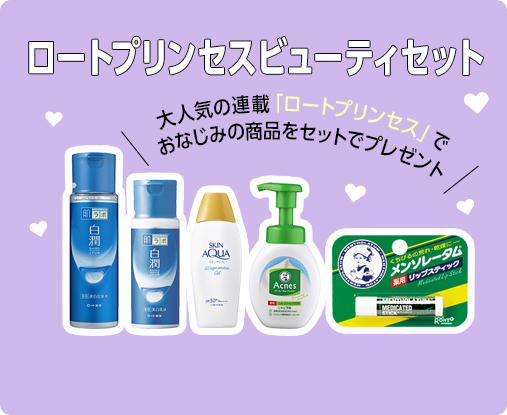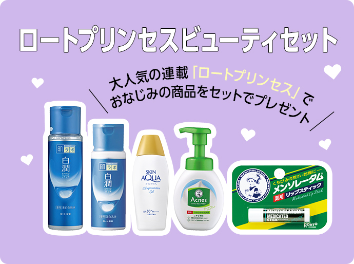 (右から)メンソレータム薬用リップスティック[医薬部外品]、メンソレータムアクネス 薬用ふわふわな泡洗顔[医薬部外品]、スキンアクア スーパーモイスチャージェル、肌ラボ 白潤薬用美白乳液・化粧水[医薬部外品]