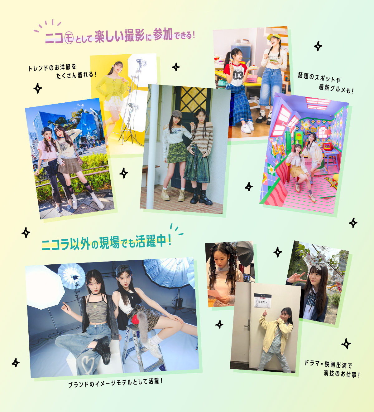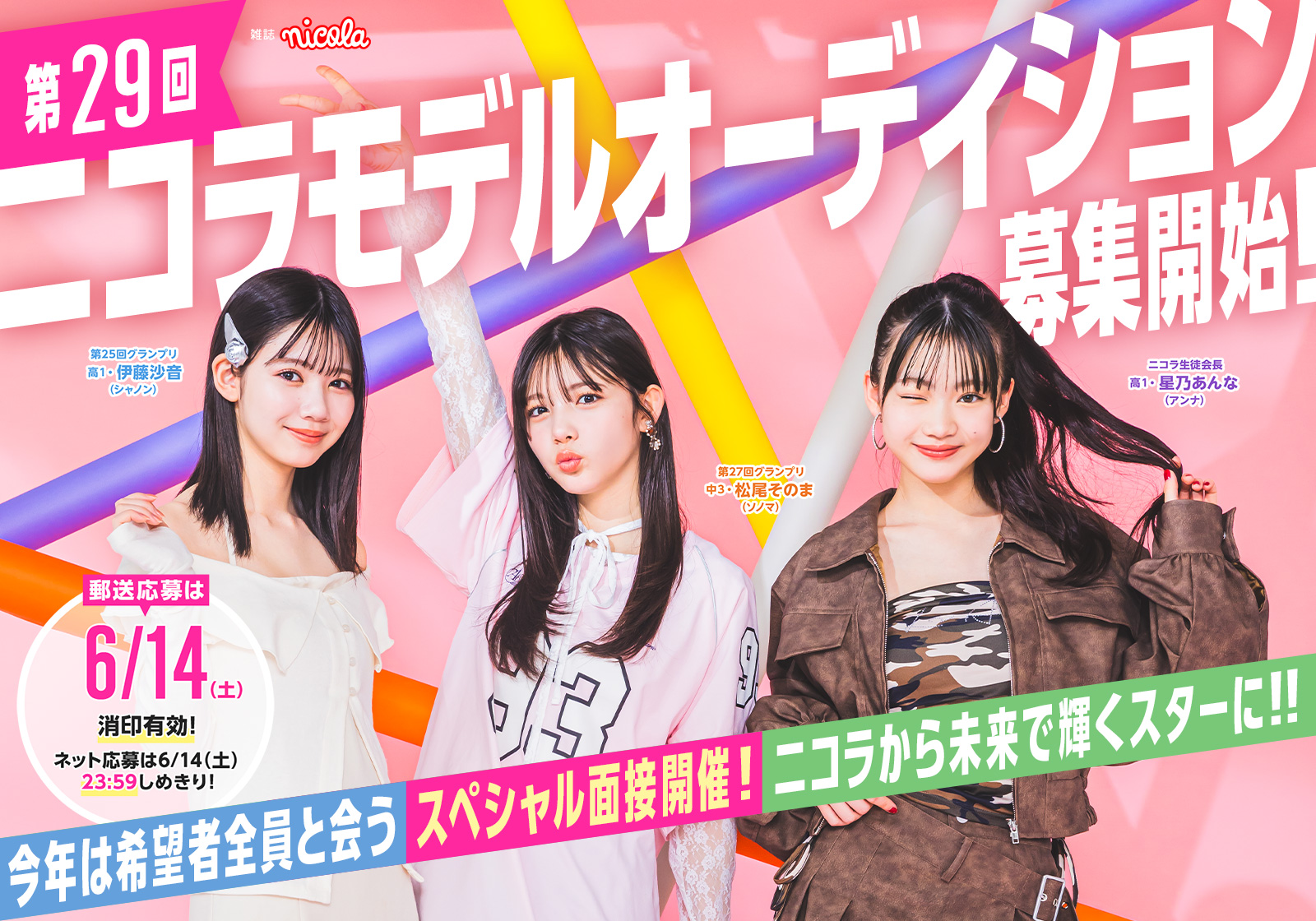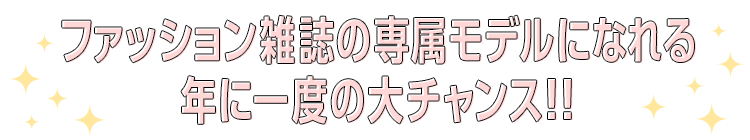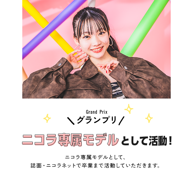 | 応募資格 | • 10歳(小5)~15歳(中3)の⼥の子 • 身長は何cmでも応募可 • 居住地は問いません 事務所に所属している子も応募できるよ! 【⾃分で応募】 「ニコ㋲になりたい!」「芸能界デビューしたい!」などの夢がある子はぜひ! 応募したことは友だちにはバレないので安心してね。保護者の方に許可をもらうのを忘れずに! 【友だちすいせんで応募】※郵送応募のみ 姉妹や友だちにニコ㋲にすいせんしたい子がいたら、本⼈に許可をもらって二コラ本誌についている応募用紙で送ってね。 |